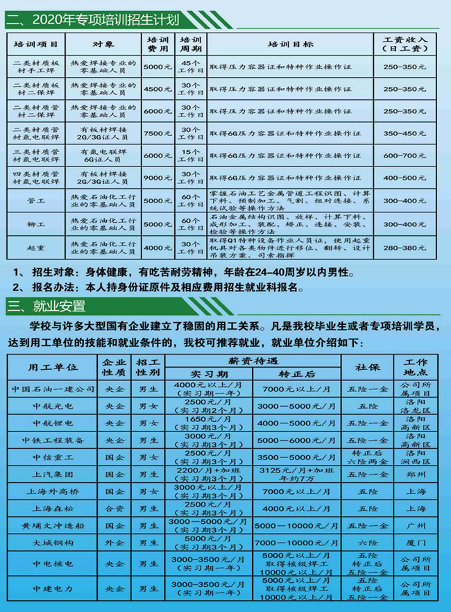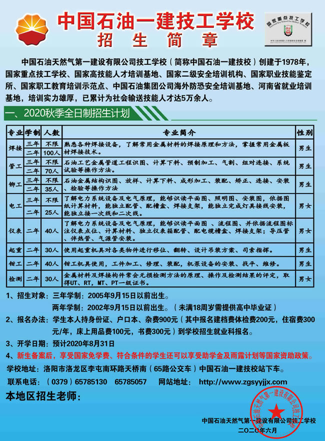中国石油天然气第一建设有限公司技工学校 电话:65785130(招生办) 65785057(就业科) 地址:洛阳市洛龙区南山大道 网址:www.zgsyyjjx.com