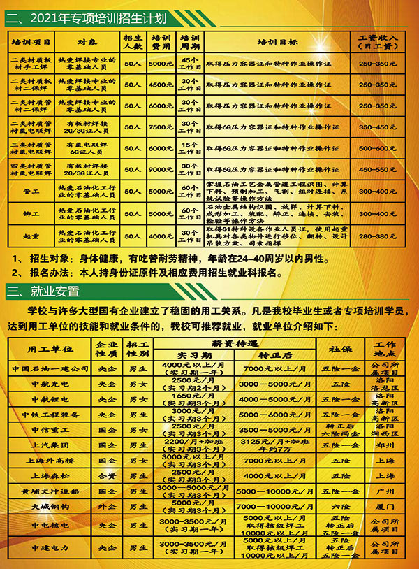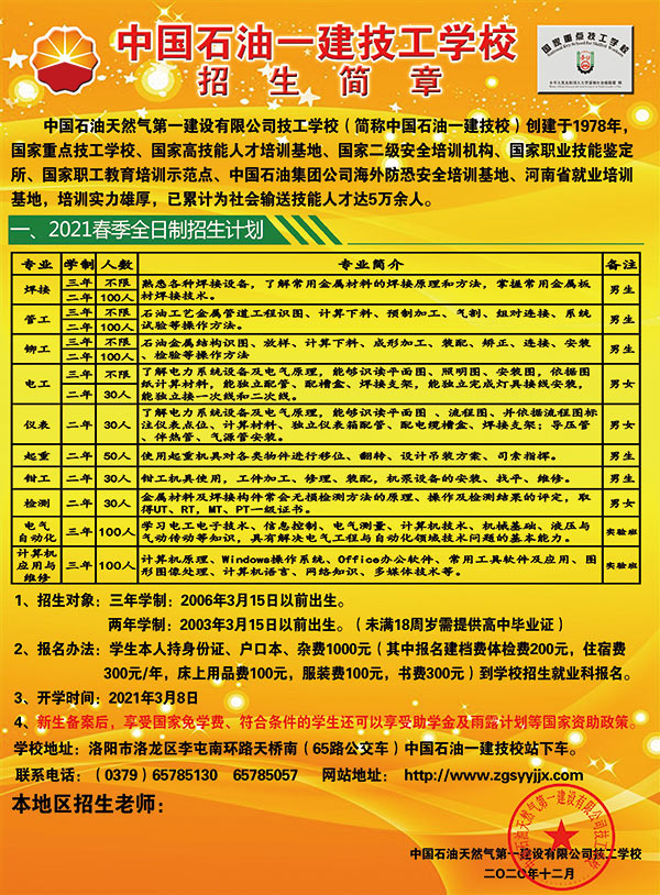 中国石油天然气第一建设有限公司技工学校 电话:65785130(招生办) 65785057(就业科) 地址:洛阳市洛龙区南山大道 网址:www.zgsyyjjx.com