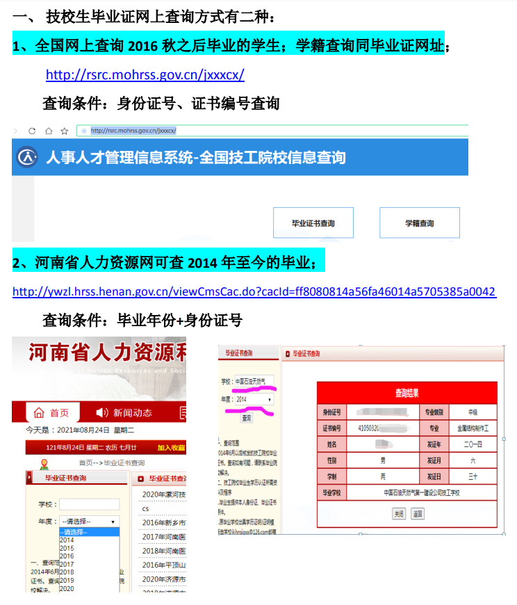 技校生毕业证网上查询方式有二种: 1、全国网上查询2016秋之后毕业的学生;学籍查询同毕业证网址; http://rsrc.mohrss.gov.cn/jxxxcx/ 查询条件:身份证号、证书编号查询 2、河南省人力资源网可查2014年至今的毕业; http://ywzl.hrss.henan.gov.cn/viewCmsCac.do?cacId=ff8080814a56fa46014a5705385a0042