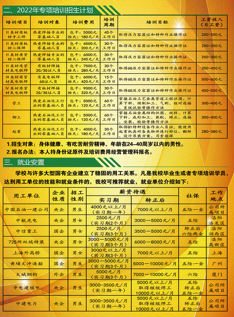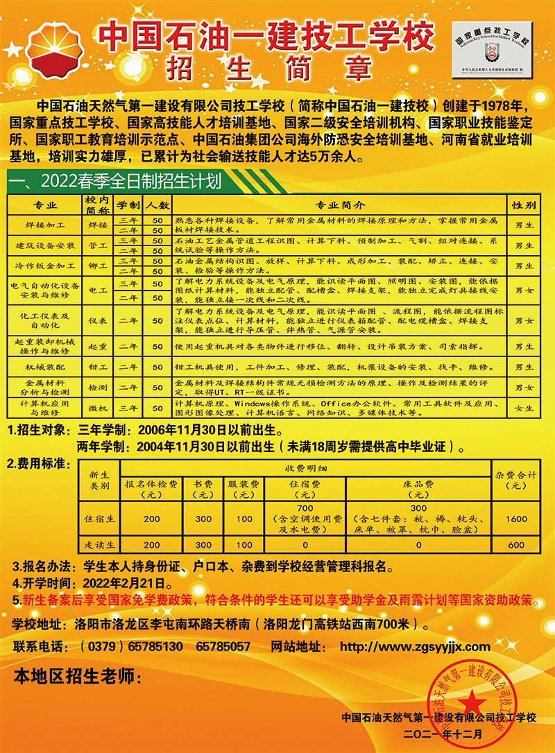 中国石油天然气第一建设有限公司技工学校 电话:65785130(招生办) 65785057(就业科) 地址:洛阳市洛龙区南山大道 网址:www.zgsyyjjx.com
