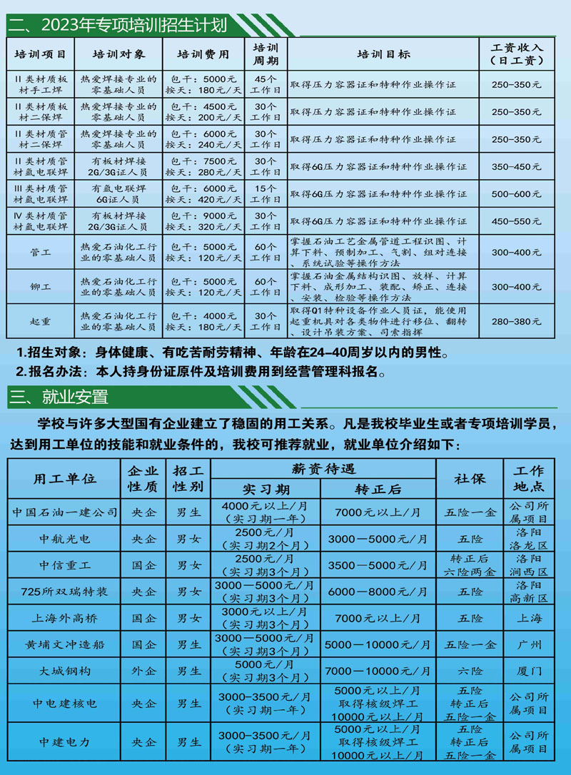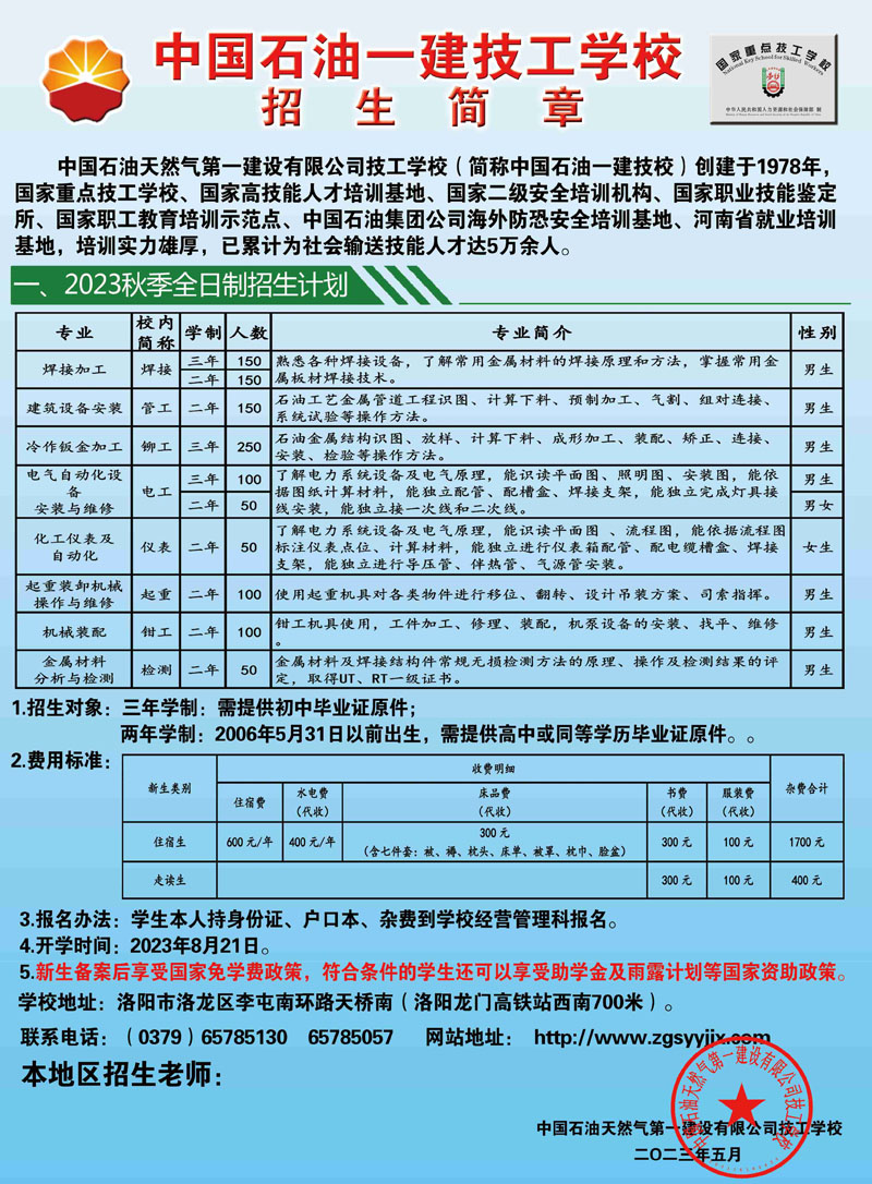 中国石油天然气第一建设有限公司技工学校 电话:65785130(招生办) 65785057(就业科) 地址:洛阳市洛龙区南山大道 网址:www.zgsyyjjx.com