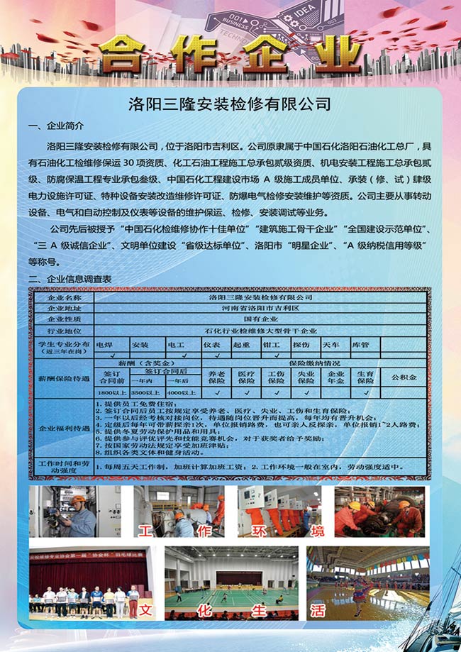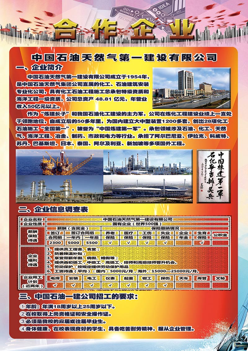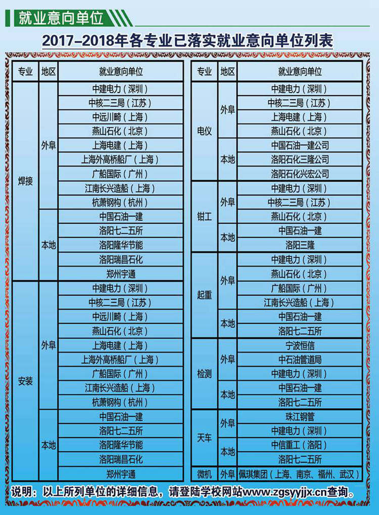 中国石油天然气第一建设有限公司技工学校 电话:65785130(招生办) 65785057(就业科) 地址:洛阳市洛龙区南山大道 网址:www.zgsyyjjx.com