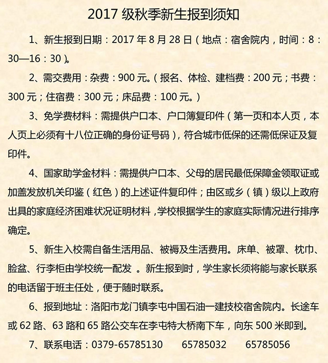 中国石油天然气第一建设有限公司技工学校 电话:65785130(招生办) 65785057(就业科) 地址:洛阳市洛龙区南山大道 网址:www.zgsyyjjx.com