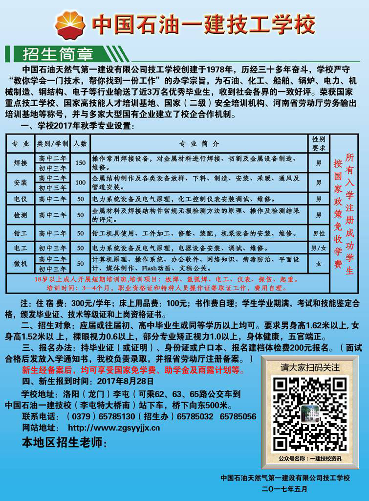 中国石油天然气第一建设有限公司技工学校 电话:65785130(招生办) 65785057(就业科) 地址:洛阳市洛龙区南山大道 网址:www.zgsyyjjx.com