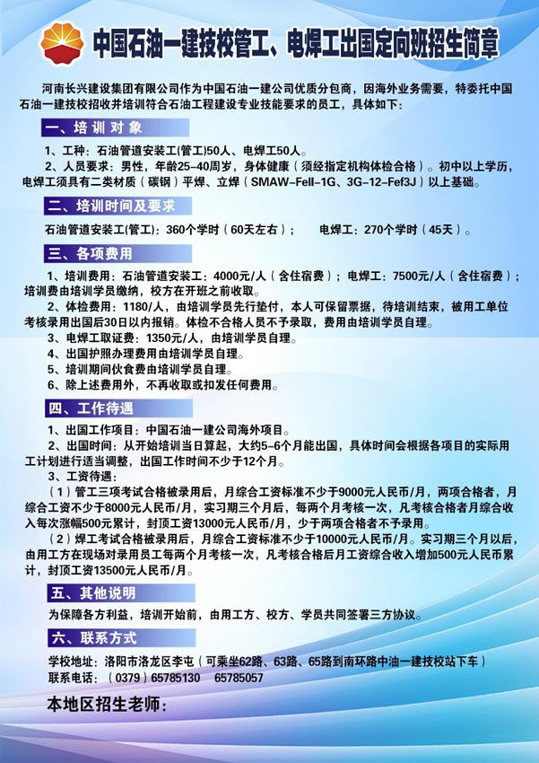 中国石油天然气第一建设有限公司技工学校 电话:65785130(招生办) 65785057(就业科) 地址:洛阳市洛龙区南山大道 网址:www.zgsyyjjx.com