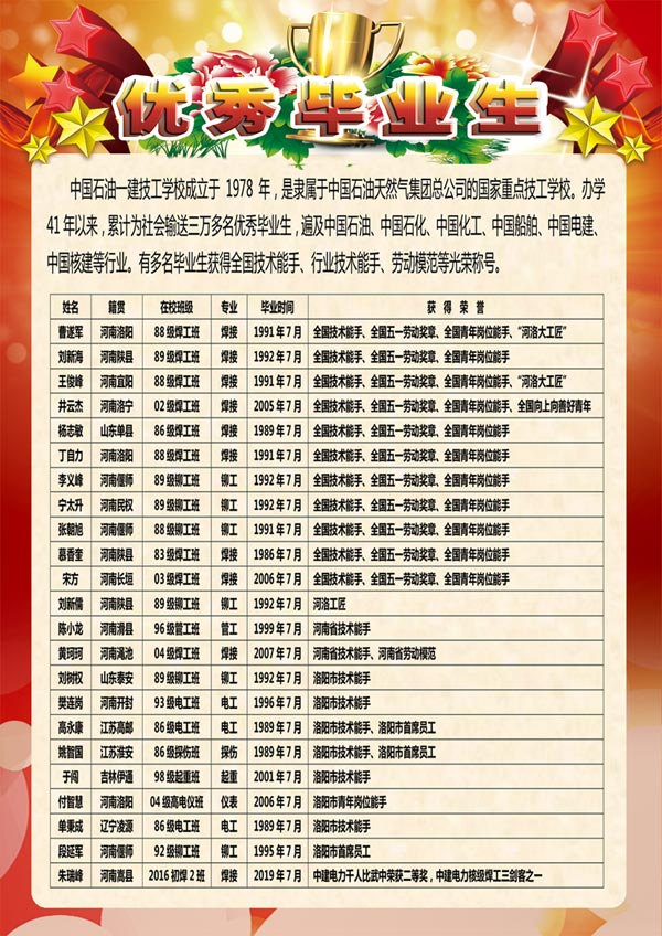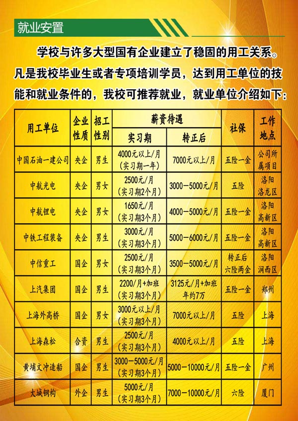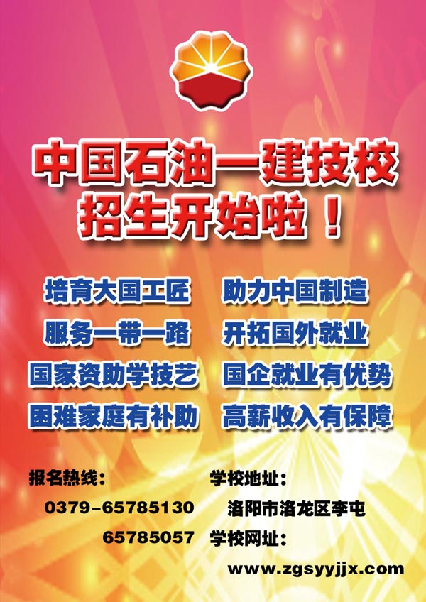 中国石油天然气第一建设有限公司技工学校 电话:65785130(招生办) 65785057(就业科) 地址:洛阳市洛龙区南山大道 网址:www.zgsyyjjx.com